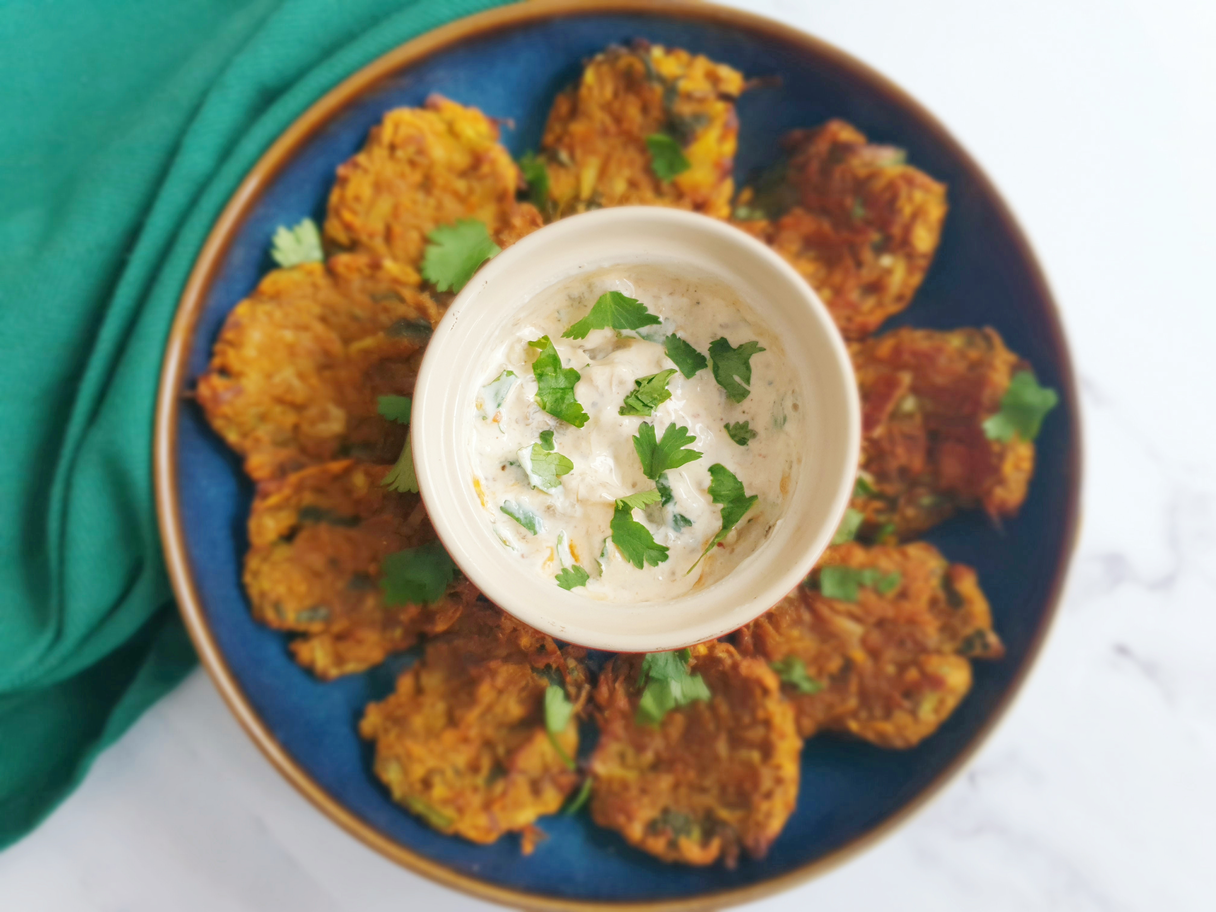 6 Garnish the fritters and dip with the remaining fresh coriander and serve with the aubergine dip.