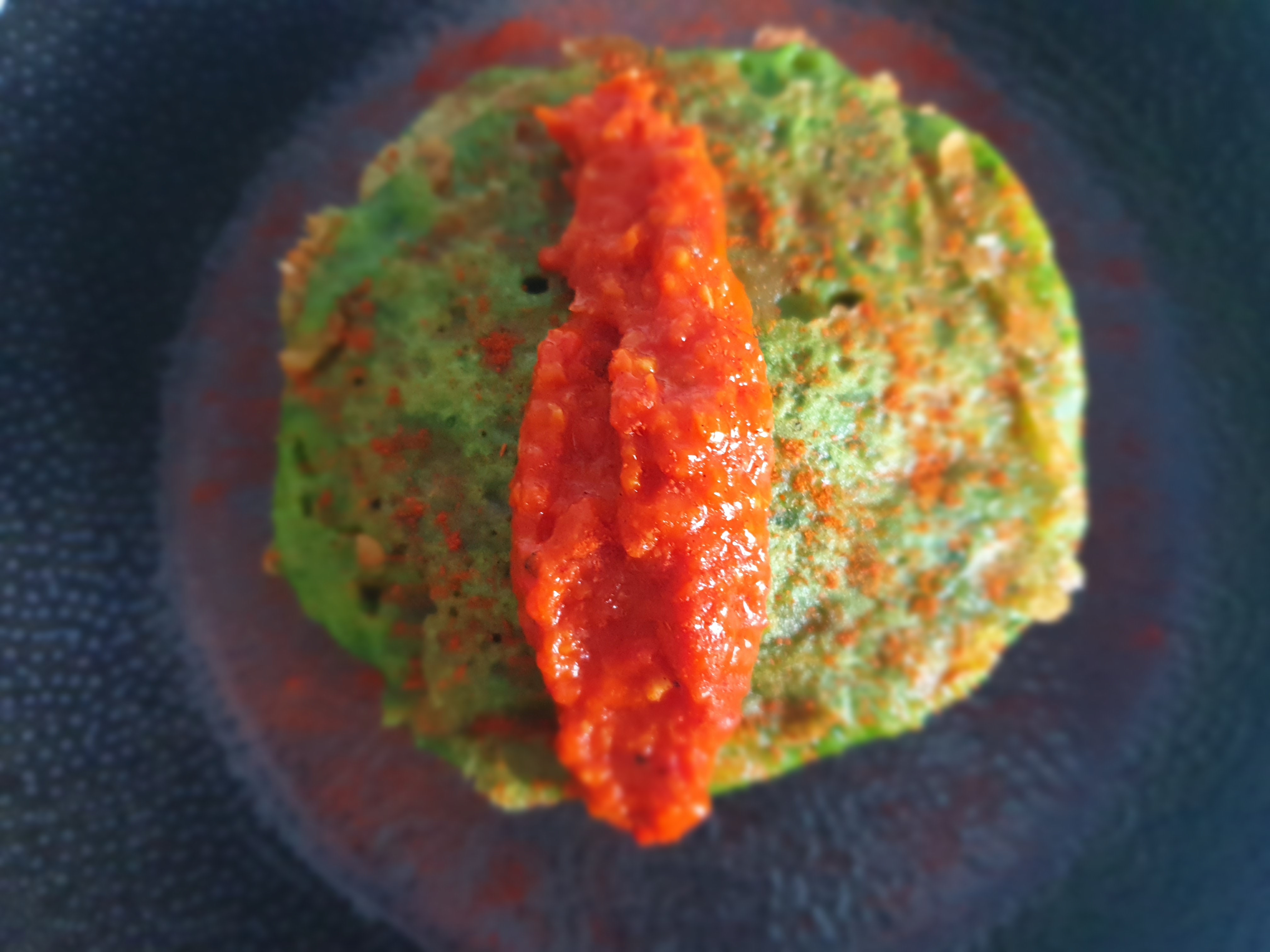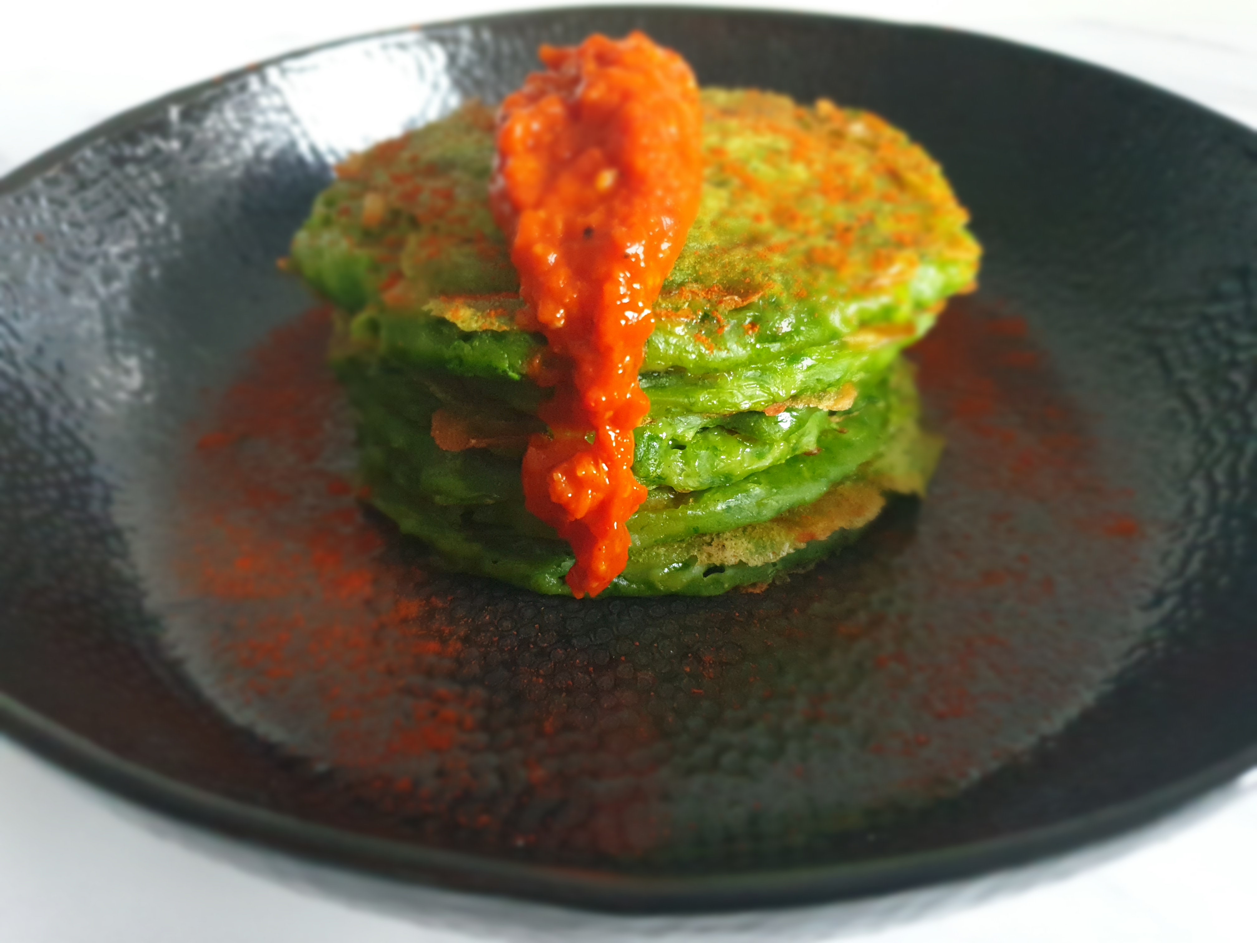 5 Serve these spinach pancakes with your favourite filling, I have topped mine with a roasted red pepper dip.