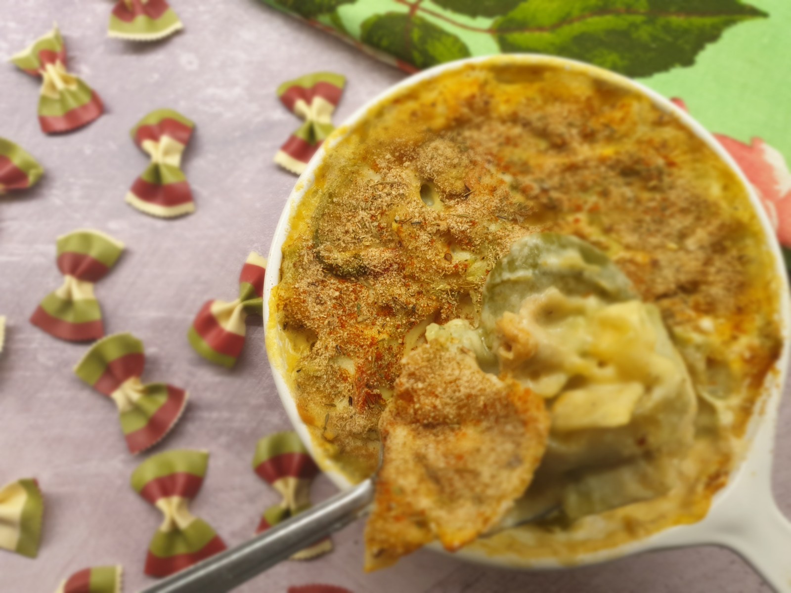 5 Add the roast vegetables to the pasta in a large baking dish, pour over the white sauce, sprinkle over breadcrumbs.