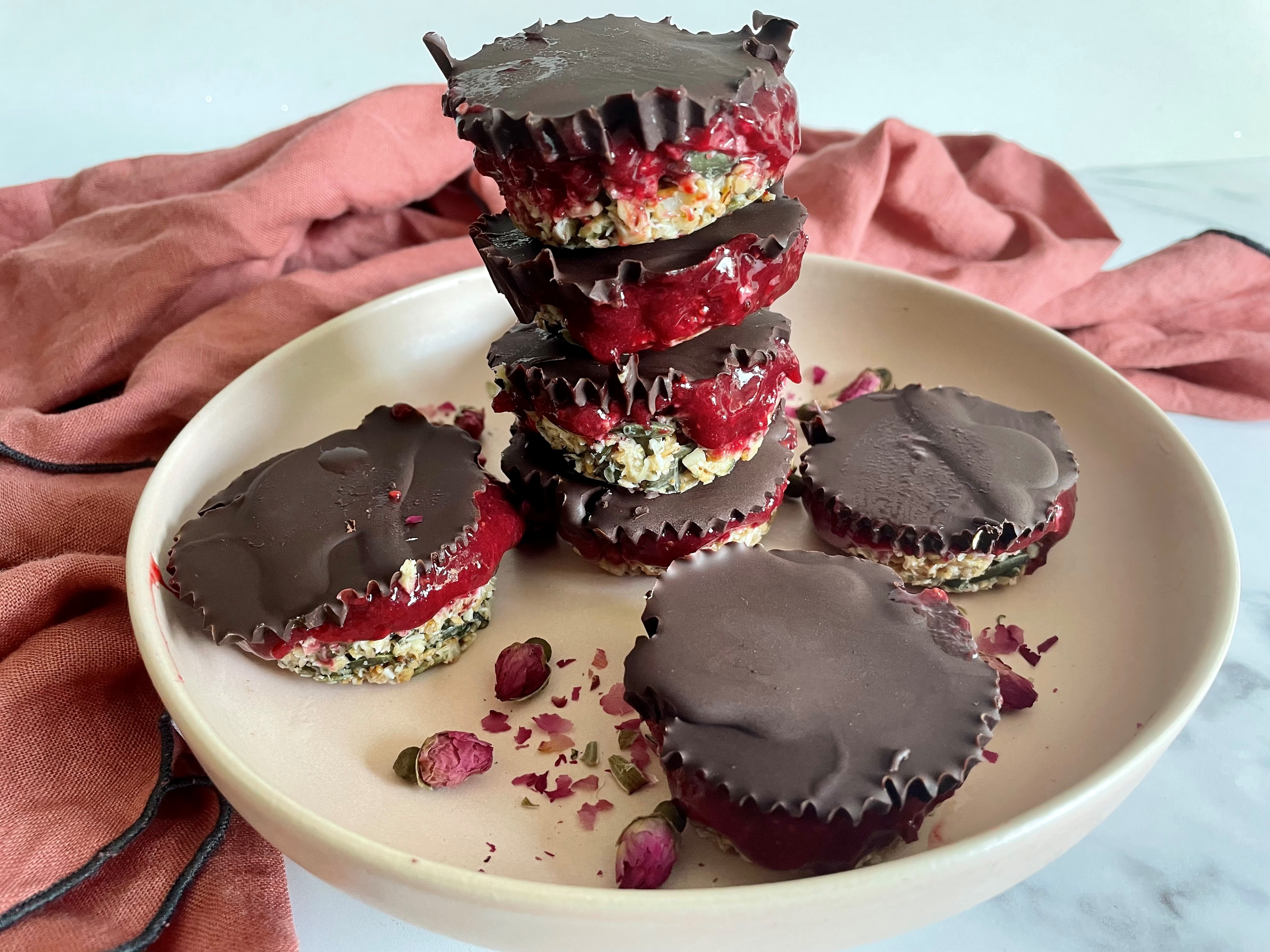 5 Melt the dark chocolate and finally pour over the jam topping, pop into the freezer until granola cups are set- About 1-2 hours.