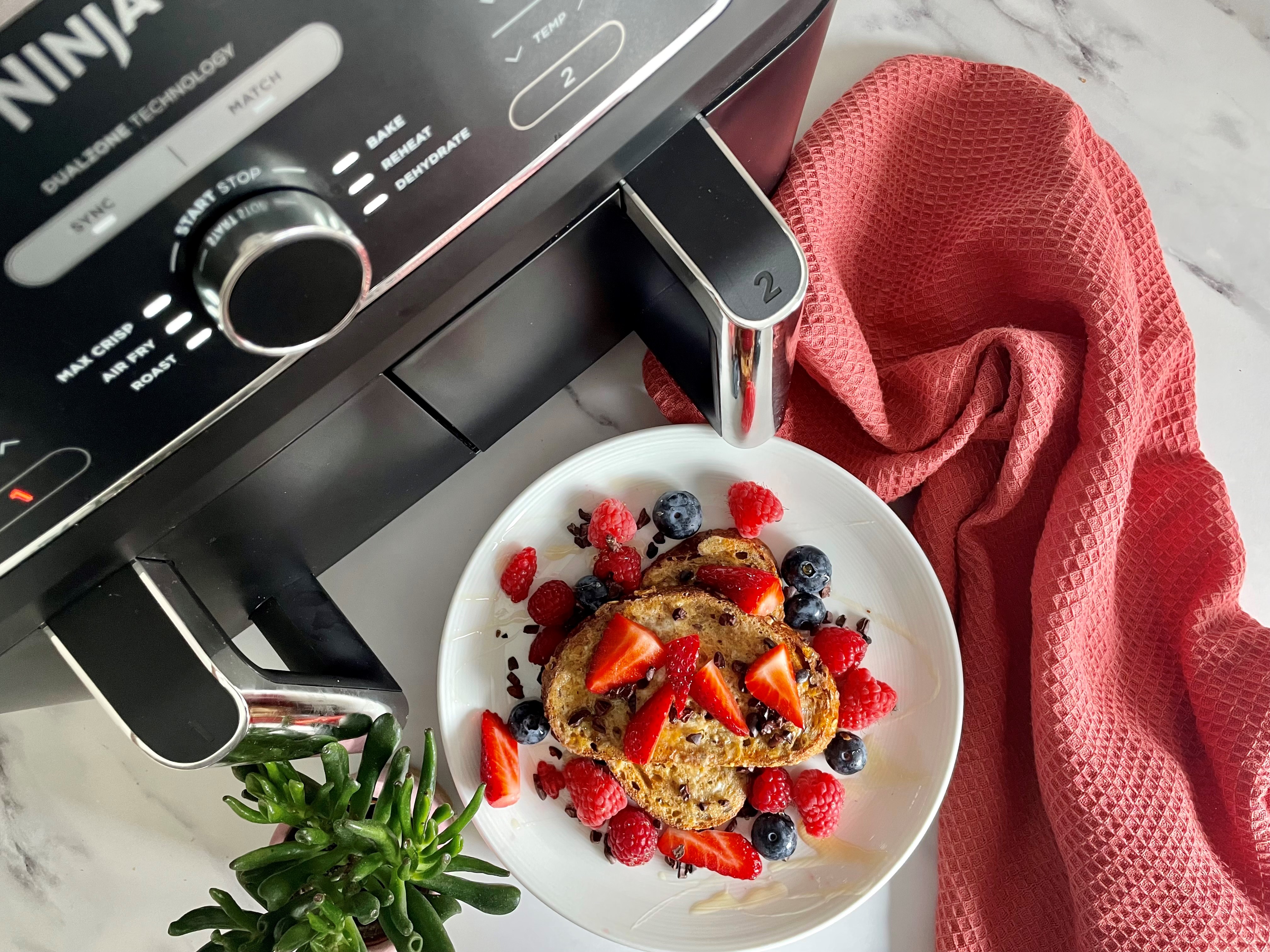 3 Place the eggy bread into the air fryer compartment, use the air fryer mode and cook for 3 minutes on each side at 200 degrees Celsius. Toast should be golden. Alternatively use a frying pan to cook the French toast.