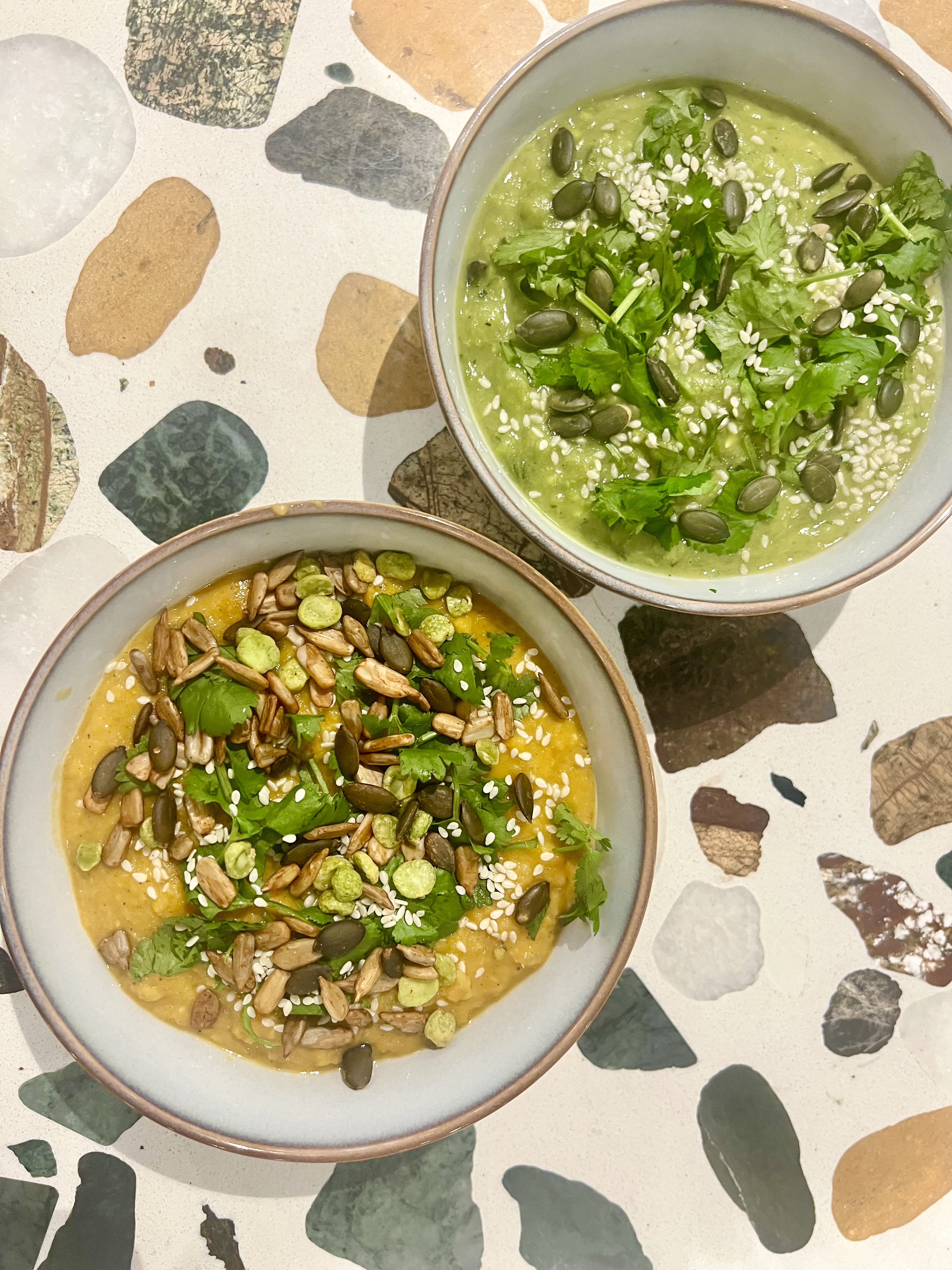 4 Stir in the coconut cream, season with salt and pepper, add more spices if required. Blitz the soup until smooth, add more water if soup is slightly thick. Squeeze in the lime and combine.