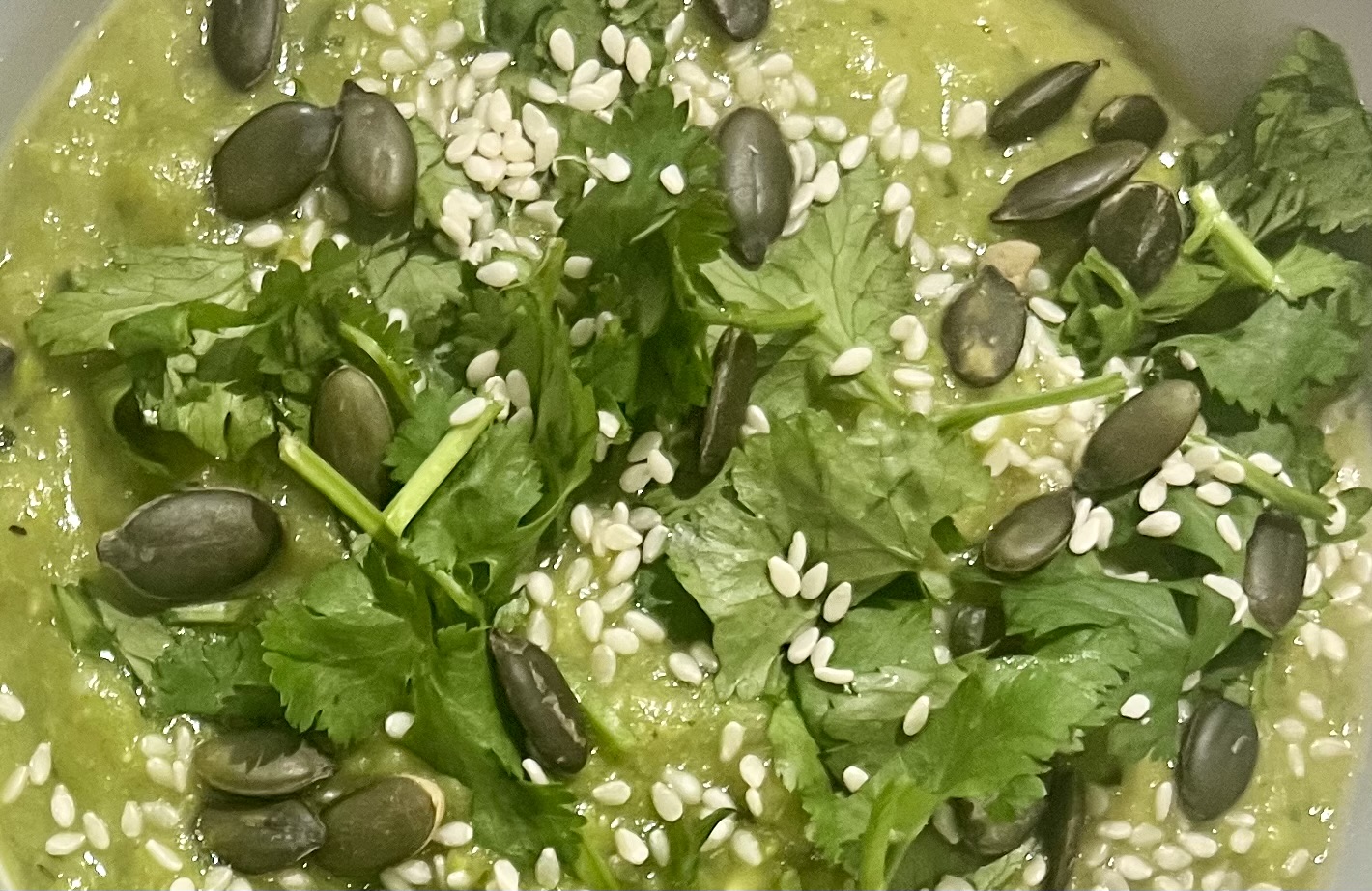 5 Pour the soup in a bowl, garnish with coriander and seeds and serve with crusty bread.