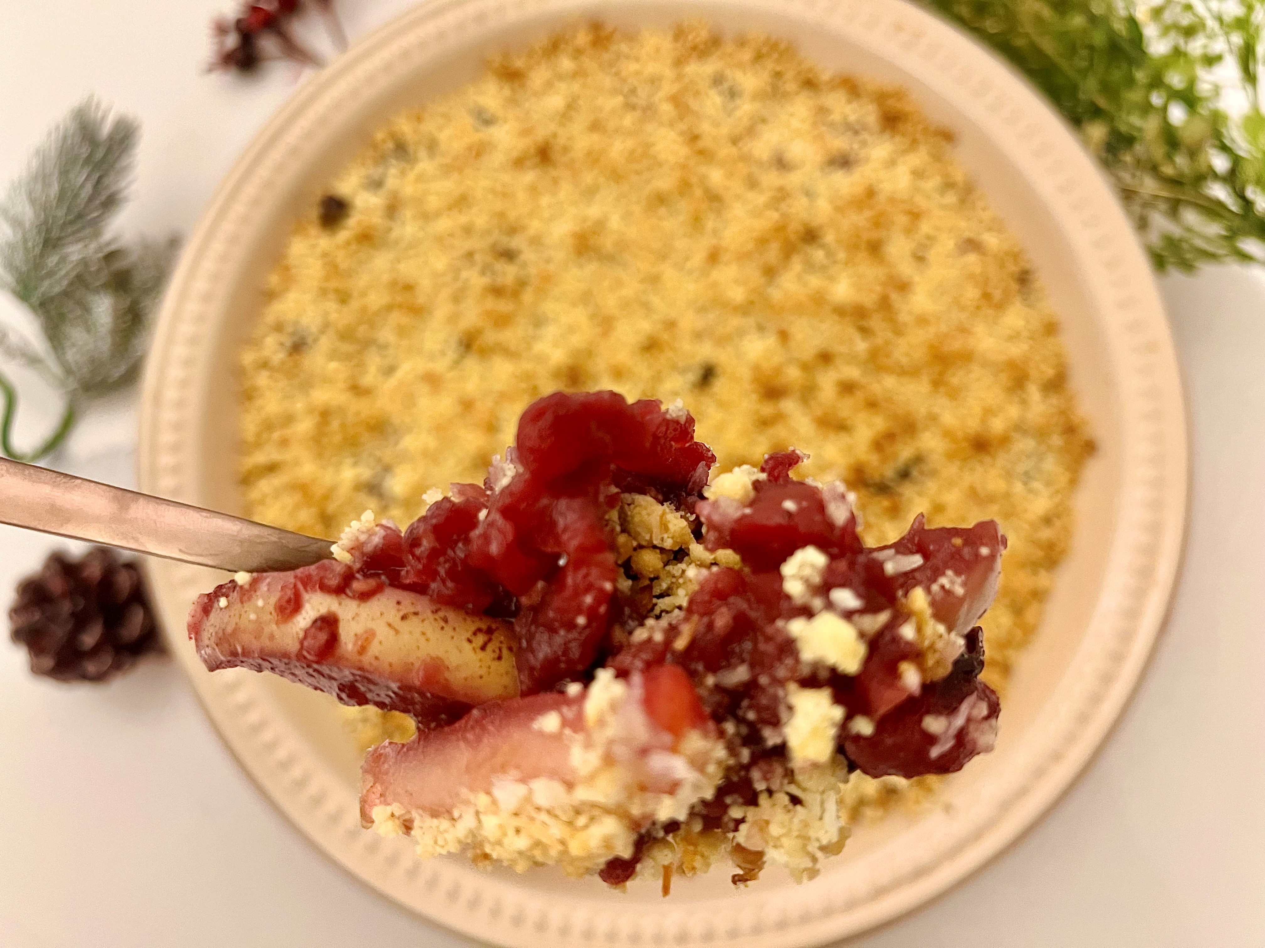 4 Add the fruit filling into a dish, top with crumble mixture and bake in the oven for about 25 minutes until golden.