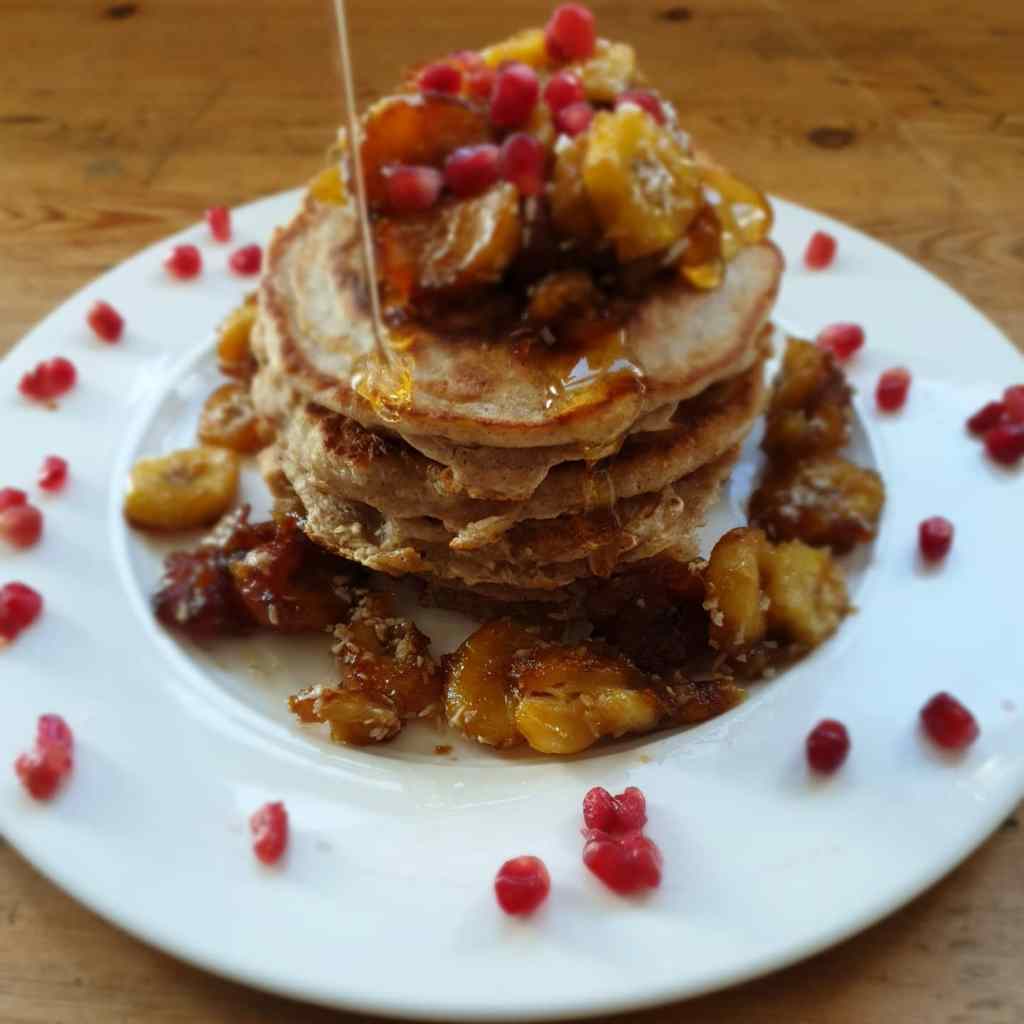 7 Stack the pancakes, top with bananas and drizzle some honey or maple syrup.