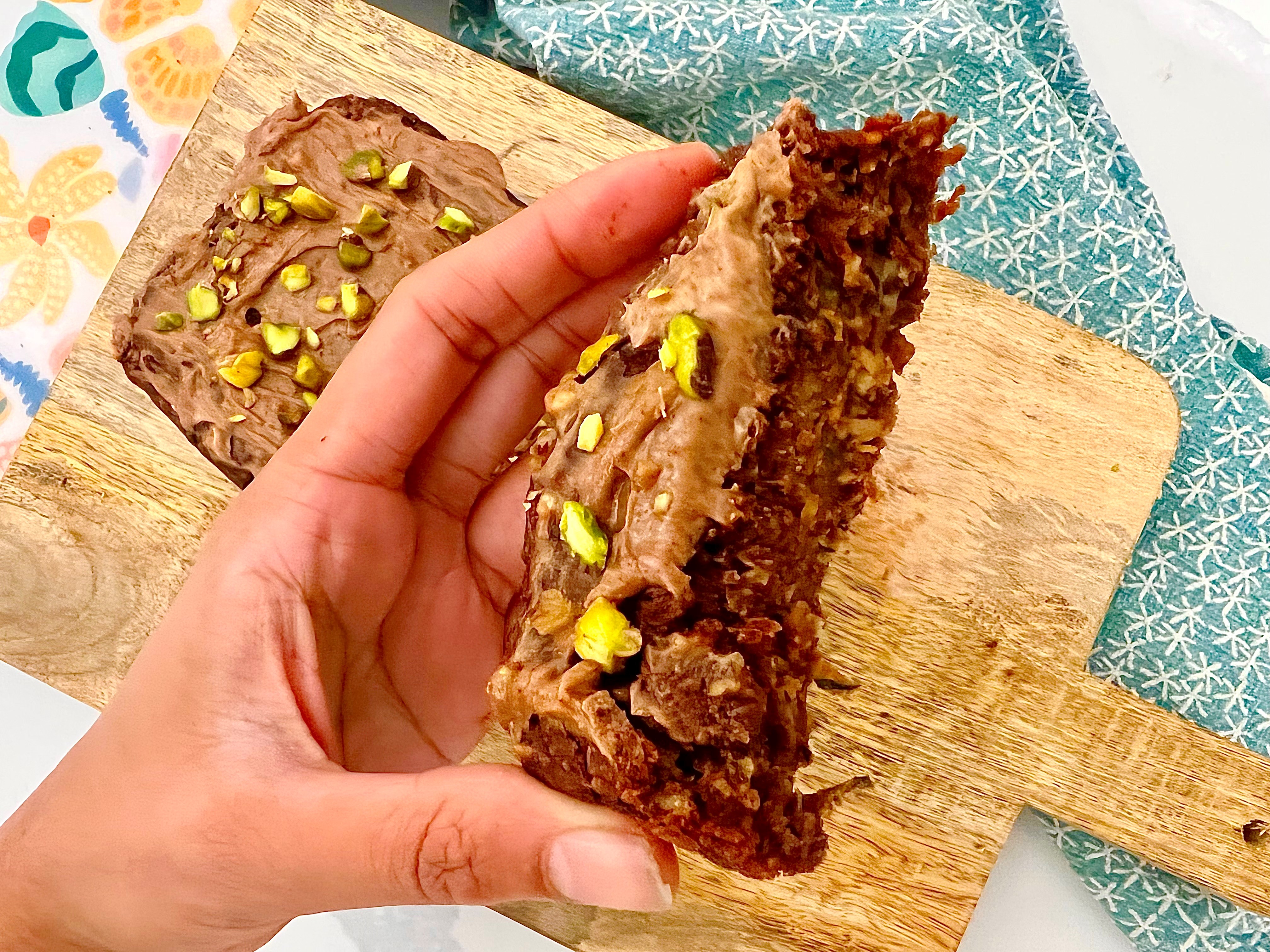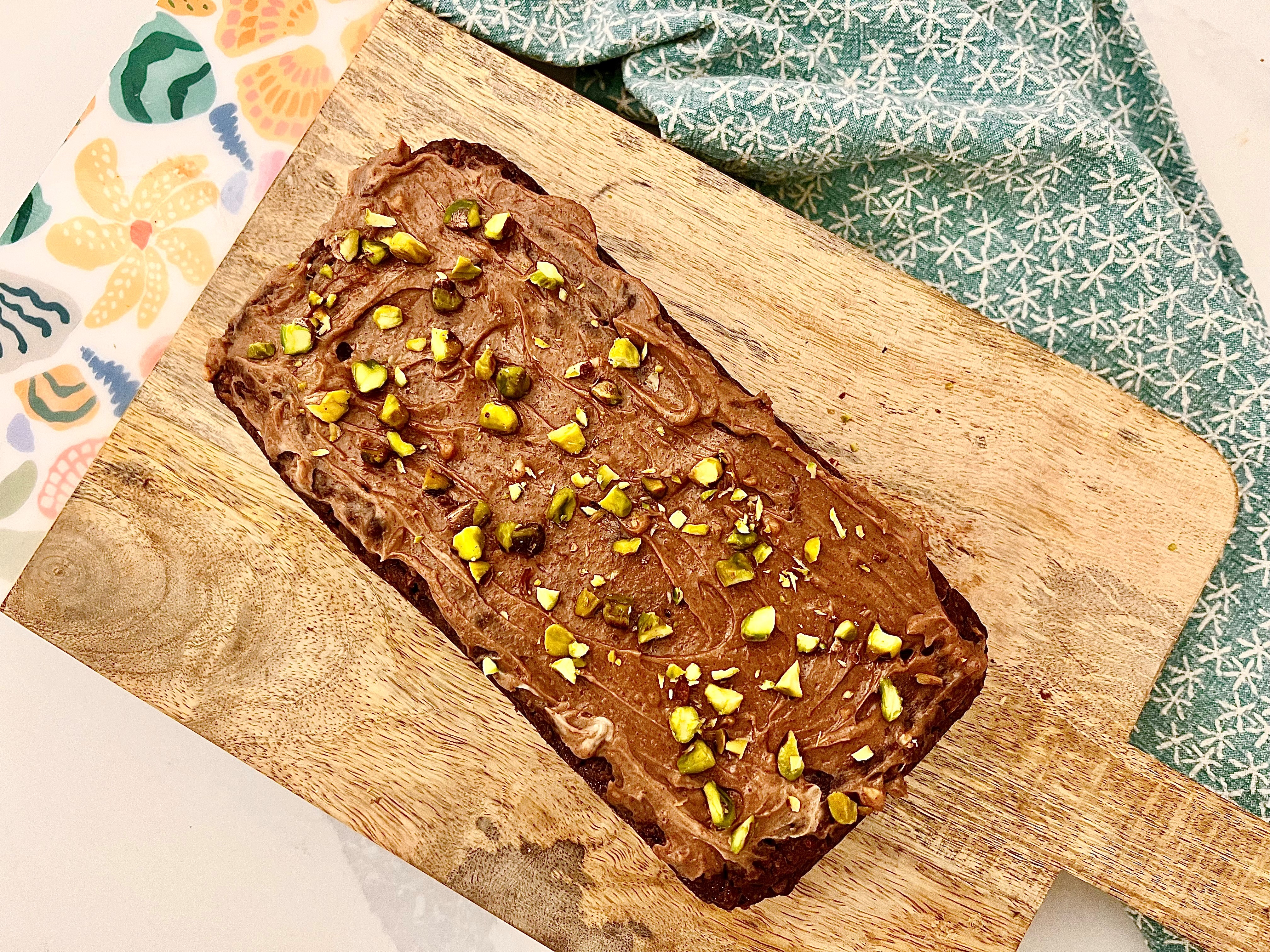 6 Allow the cake to cool, for the frosting simply beat or whip the ingredients together and spread over the loaf and sprinkle some chopped pistachios.