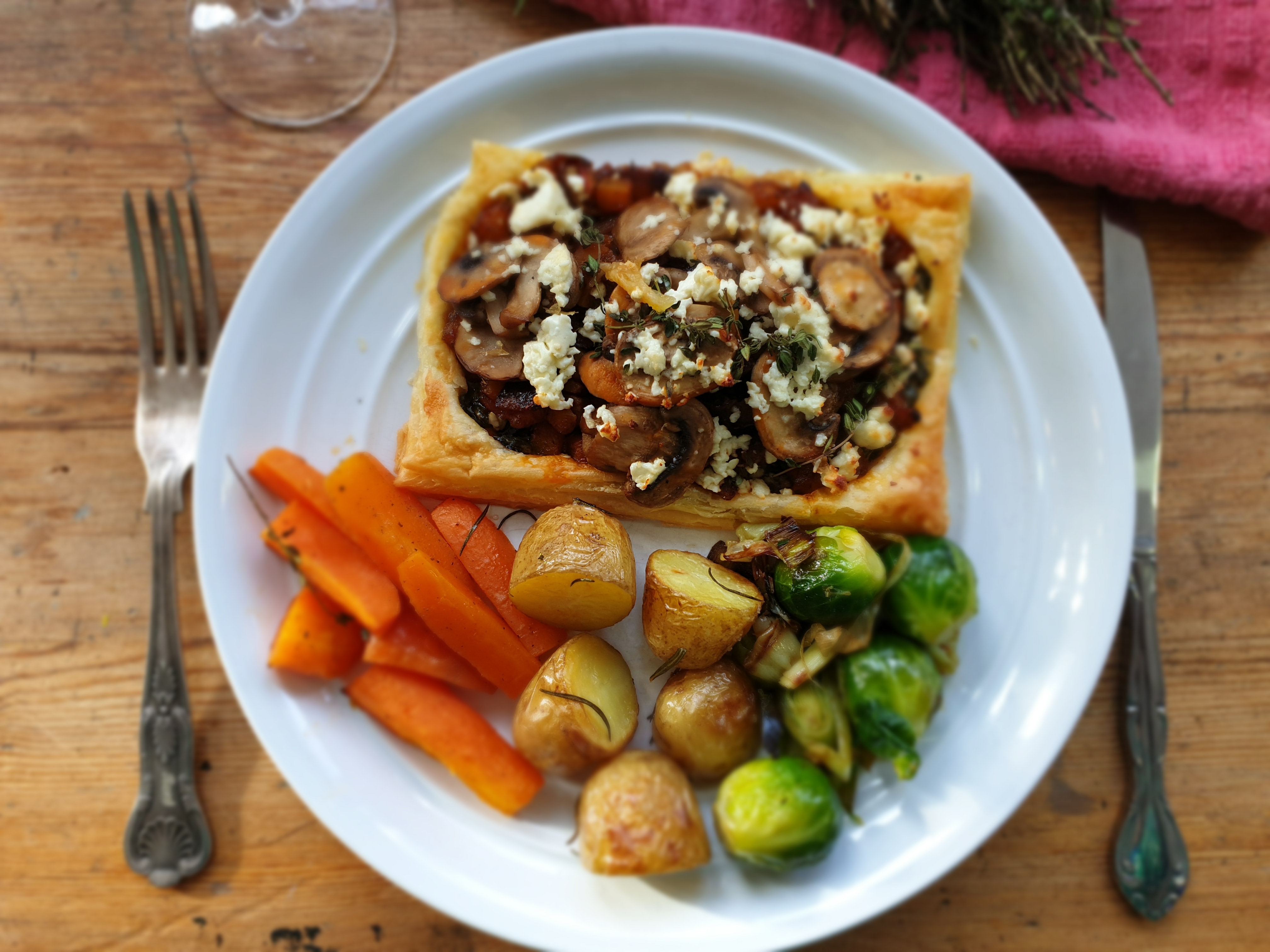 9 Serve the fish with roast potatoes, carrots, sprouts and leeks and sauce.