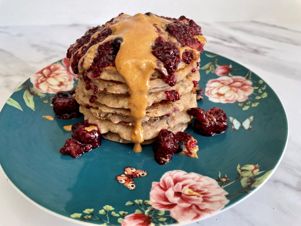 5 Stack your pancakes, add a few dollops of the jam, followed by a drizzle of smooth peanut butter and enjoy.