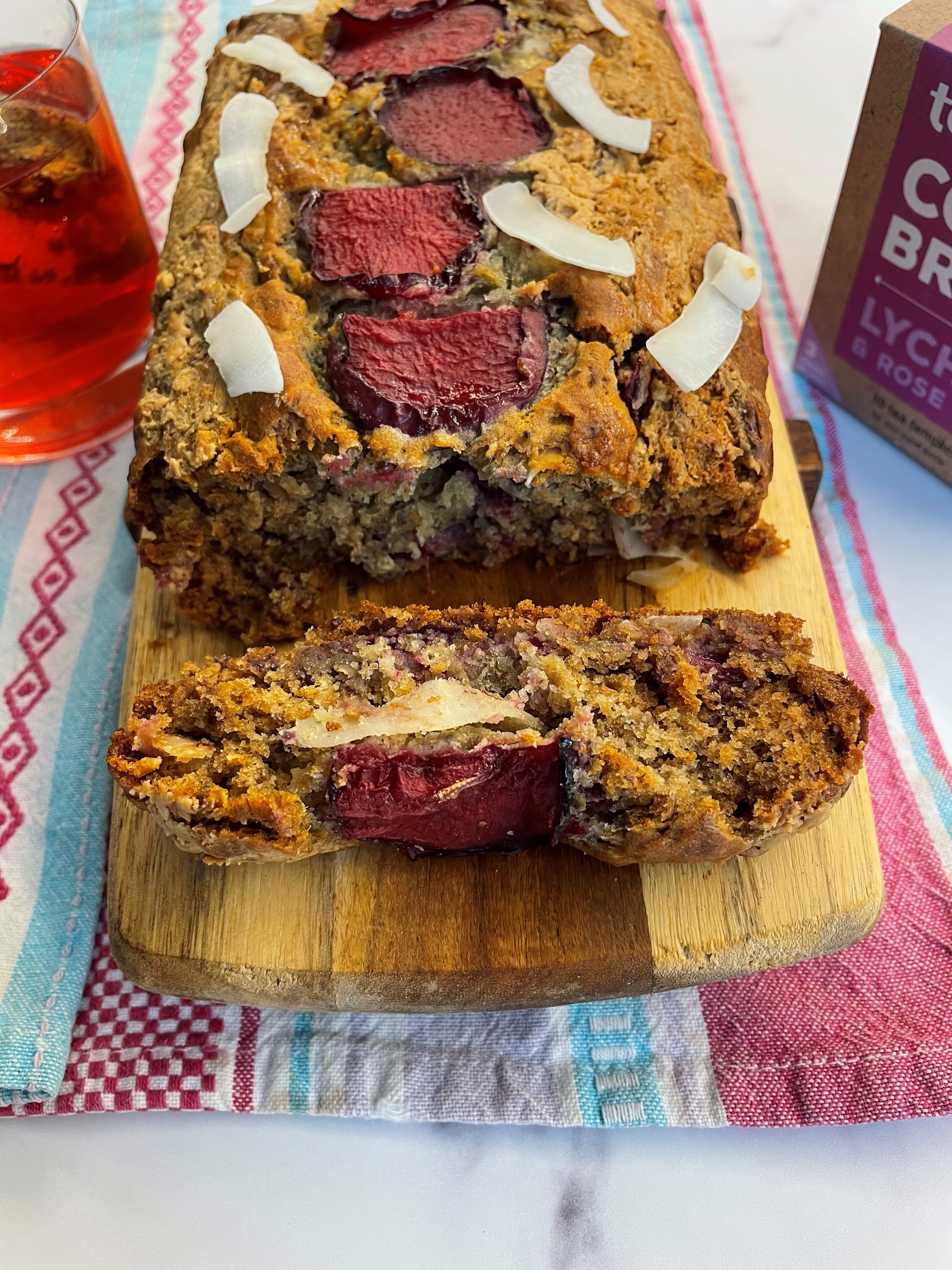 Serves 6-8, Vegan, this loaf is best served with the Lychee and Rose flavour cold brew teapigs tea