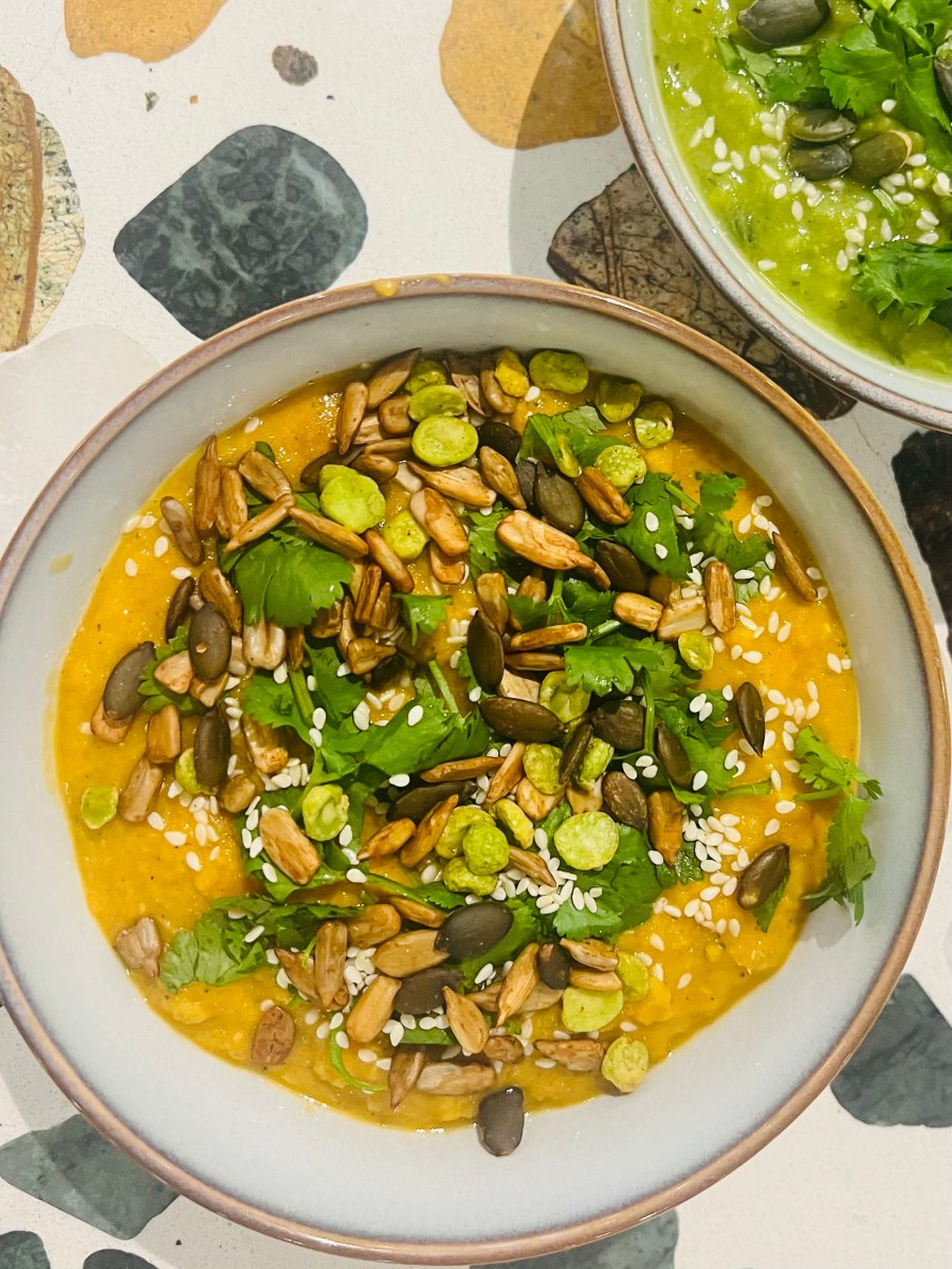 Cook this delicious, nutritious and nourishing soup, also plant based, contains fibre and protein and a it is a winter warming bowl. A simple colourful recipe, make a large batch, freeze or use for next day meals.