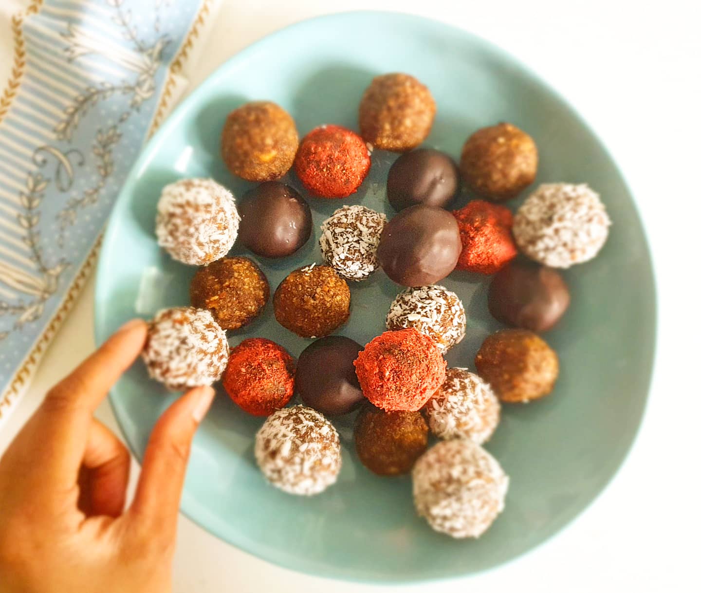 Energy & truffle balls – a perfect snack and delight to eat. These are made with dried fruit & dusted in different toppings for a colourful finish.