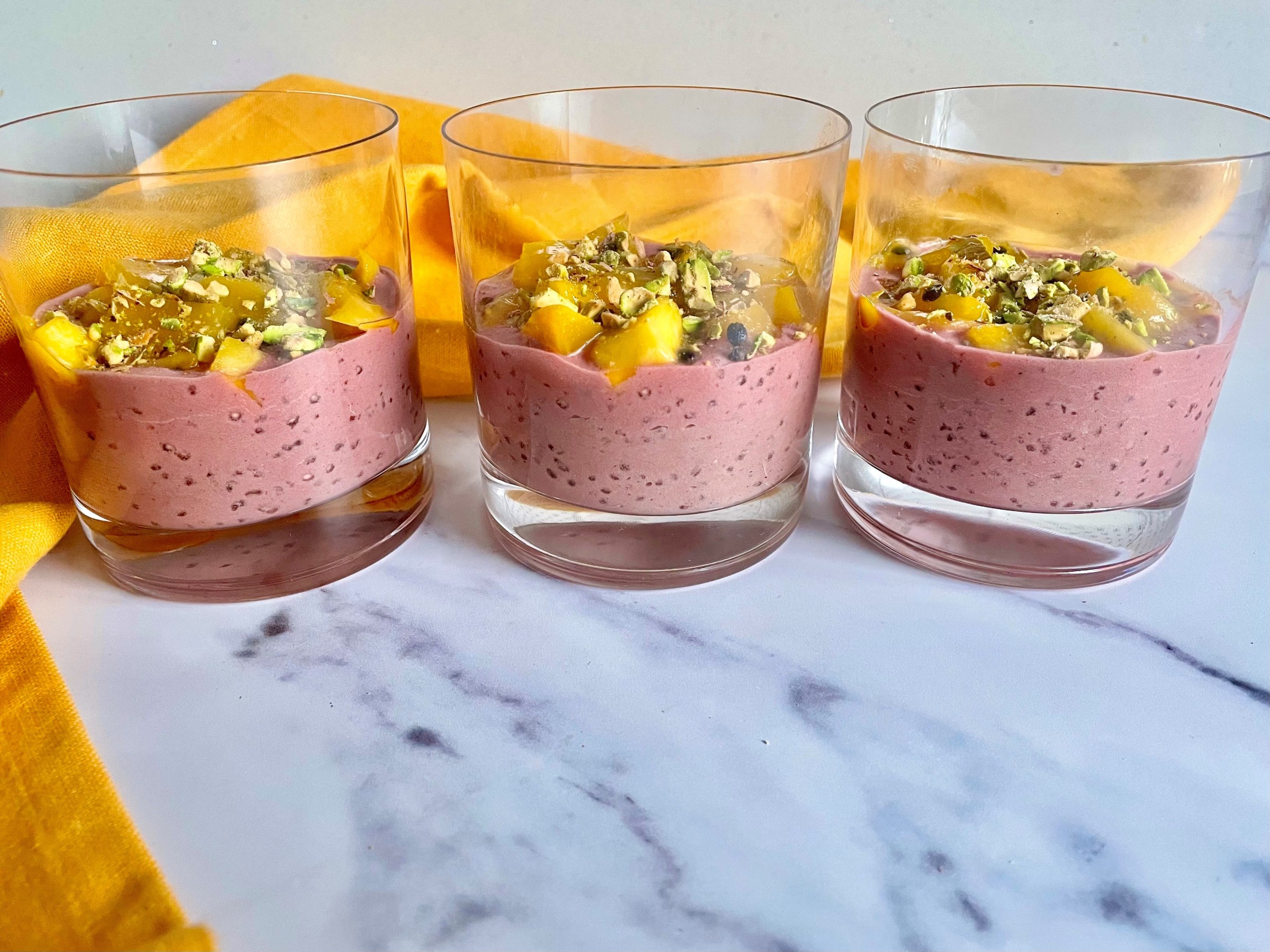 This delightful quick tropical dessert made with tapioca, mangoes, cardamom and coconut cream topped with pistachios.