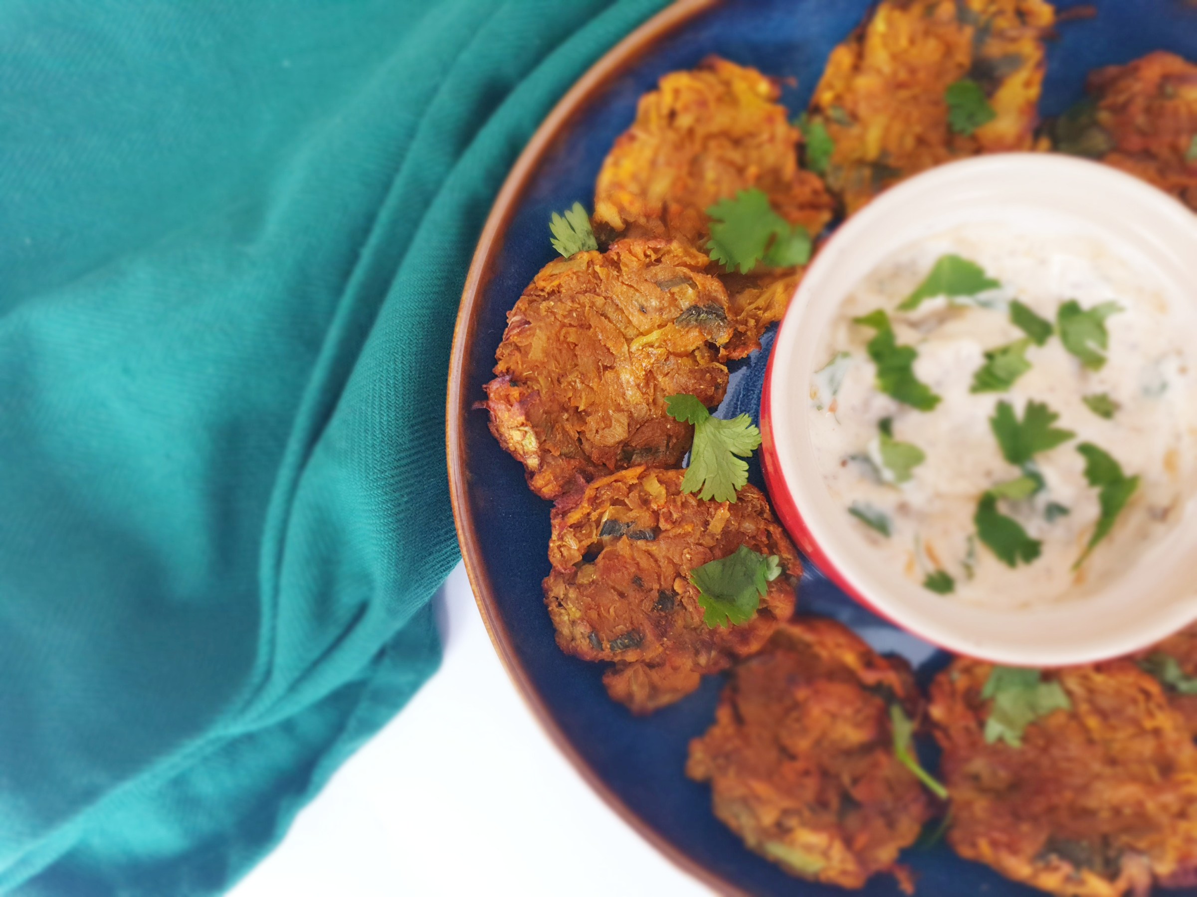 Spicy fritters made with sweet potato a great little bite served with an aubergine dip.